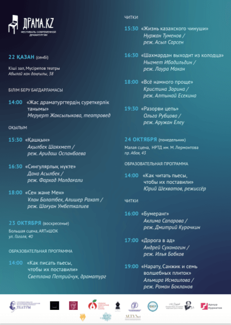 22 октября в ТЮЗ им. Мусрепова состоится лекция театроведа Меруерт Жаксылыковой, посвящённая национальной современной драматургии. 23 октября в ARTиШОКе мастер-класс по созданию пьесы проведёт драматург Светлана Петрийчук. 24 октября в театре им. Лермонтова режиссёр Юрий Шехватов расскажет о том, как сегодня ставить читки.